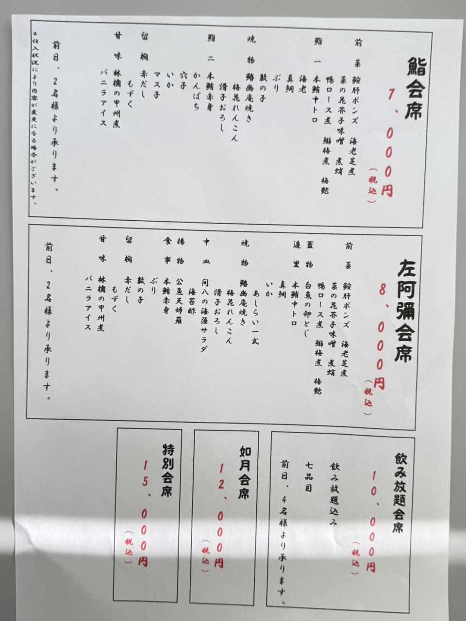 今月の「鮨会席」「左阿彌会席」のコース内容です。